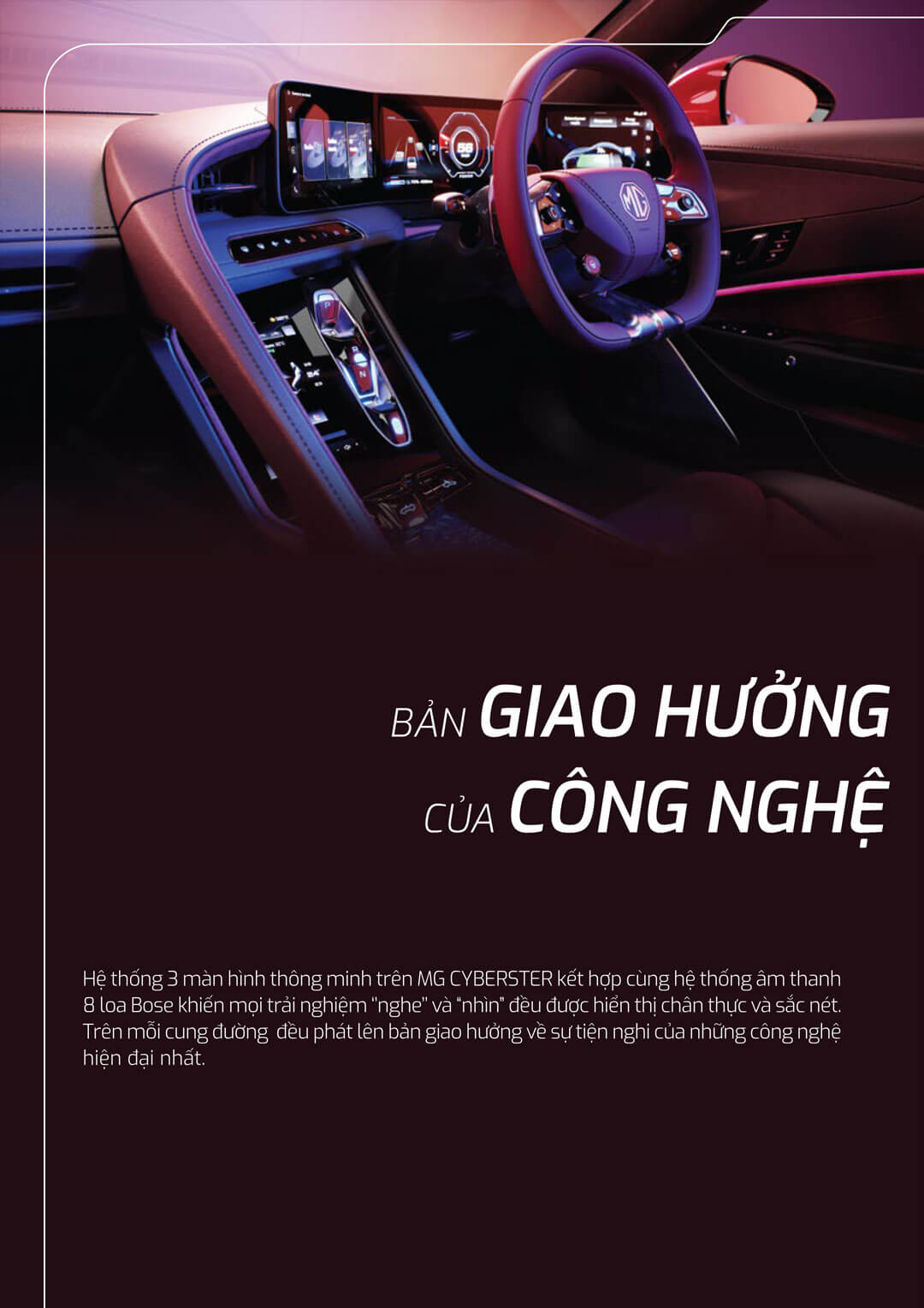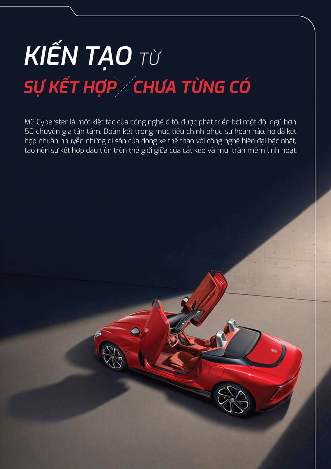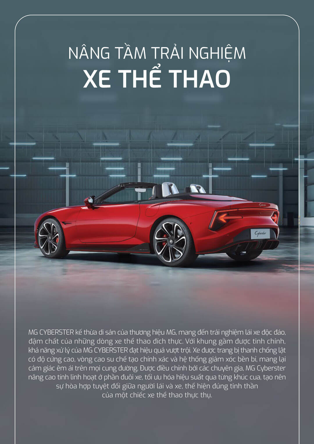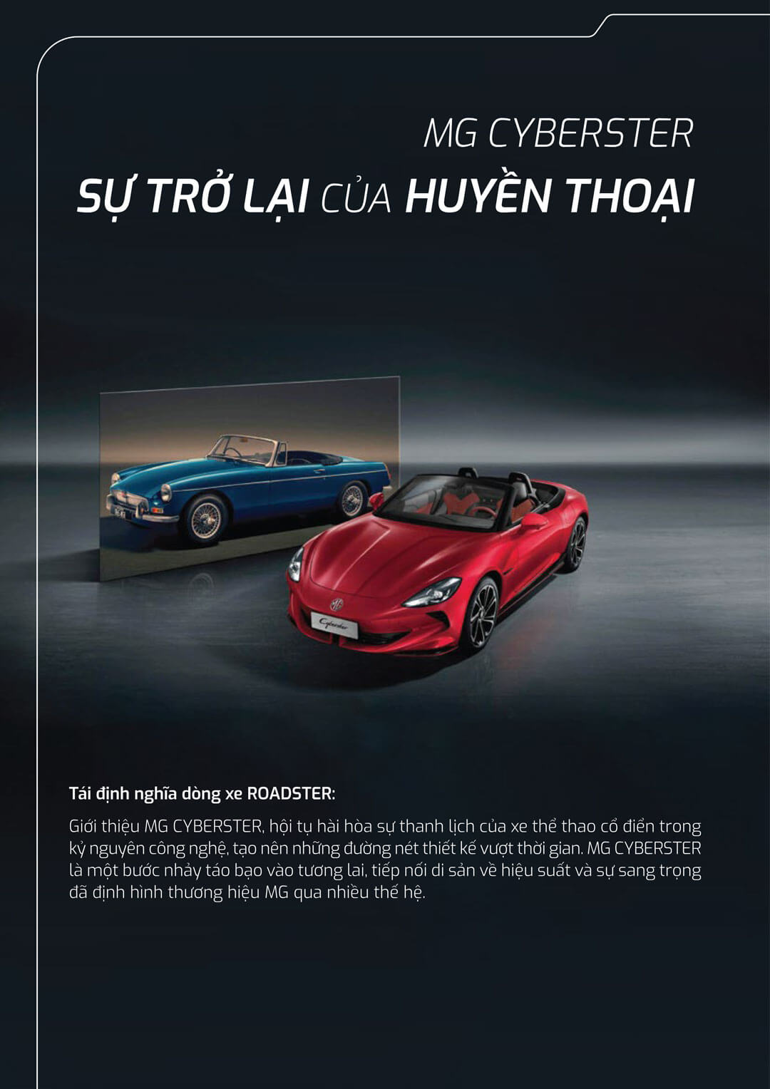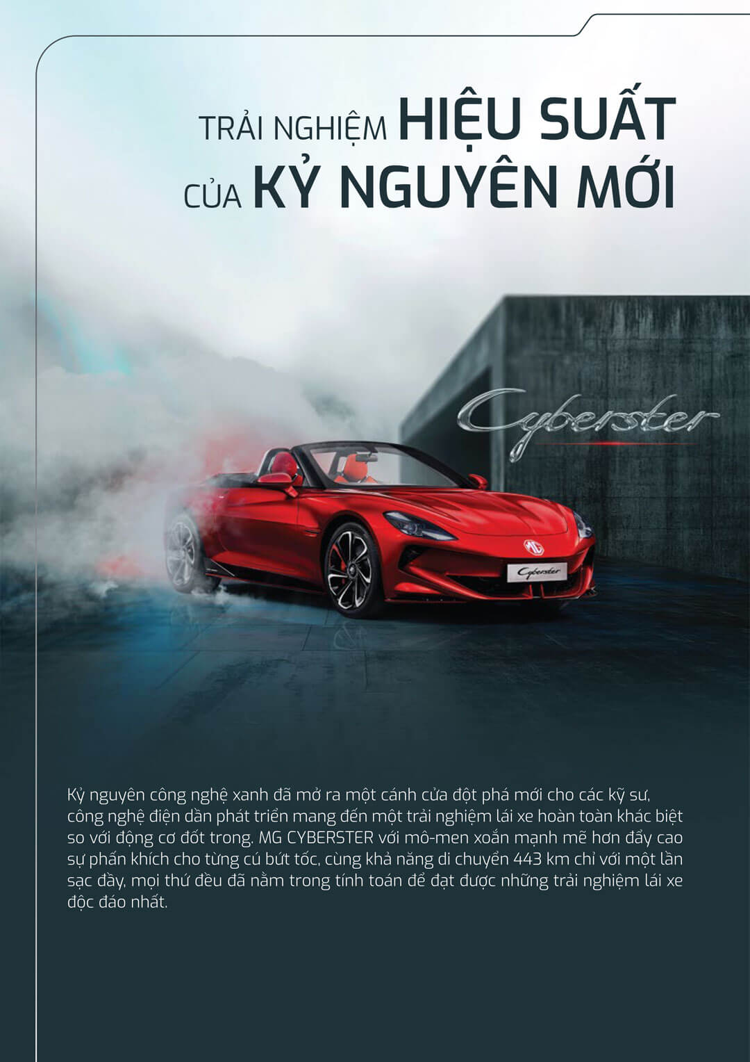 MG Cyberster là mẫu roadster thuần điện 2 chỗ, sử dụng hệ dẫn động 4 bánh với tổng công suất 536hp cho khả năng tăng tốc 0-100km/h trong chưa đầy 3.2s. MG Cyberster hội tụ những giá trị cốt lõi nhất và mang trên mình dấu ấn của MG: Hiệu suất vượt trội, Thiết kế hiện đại, và Công nghệ tiên tiến.