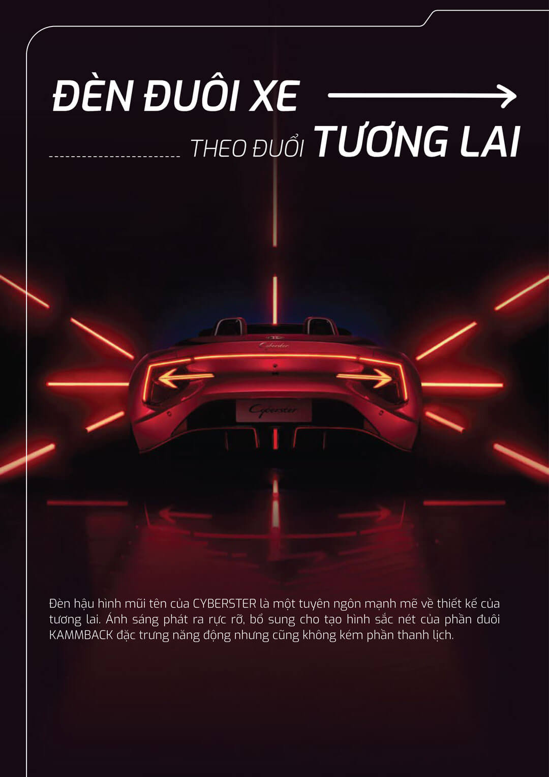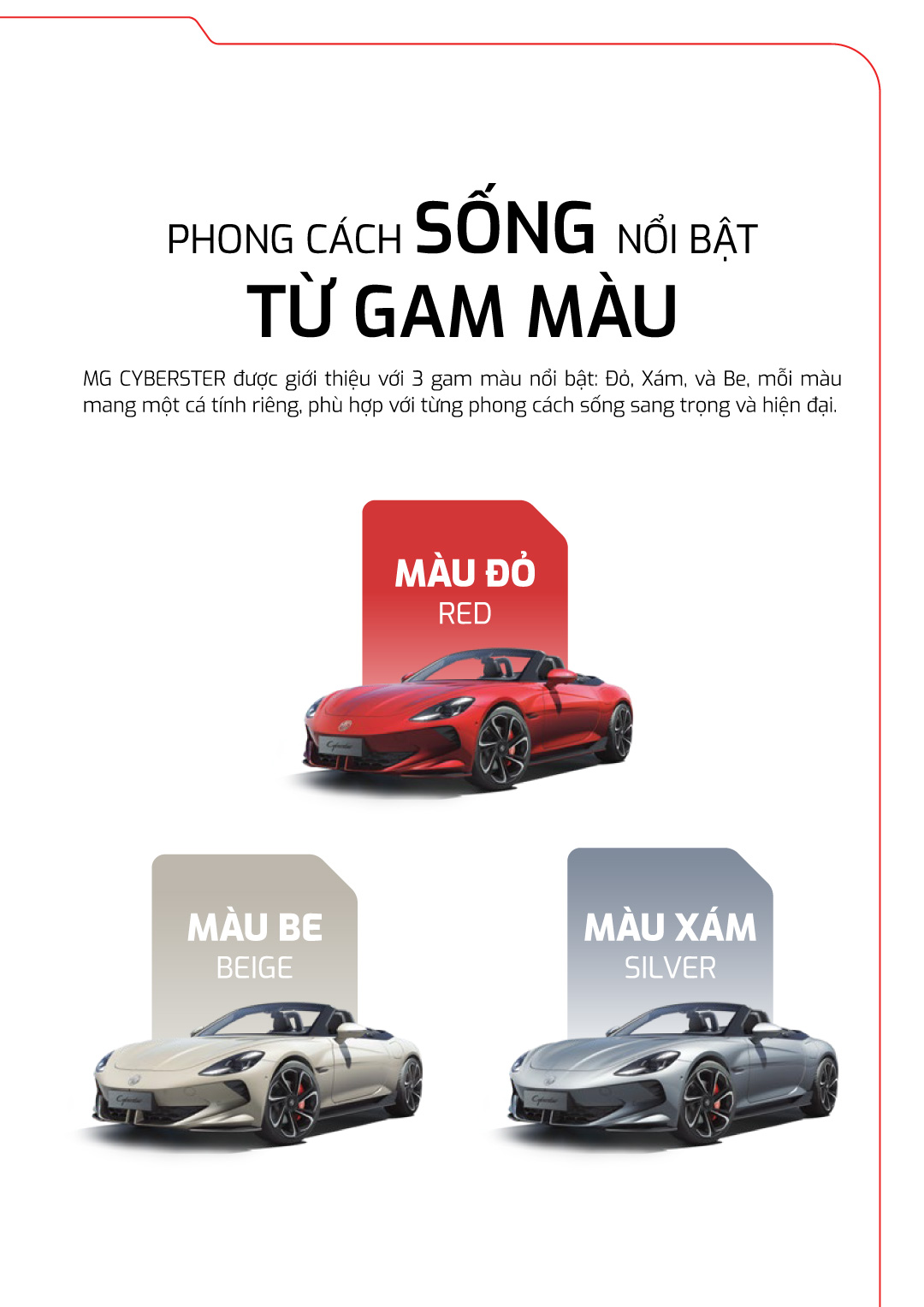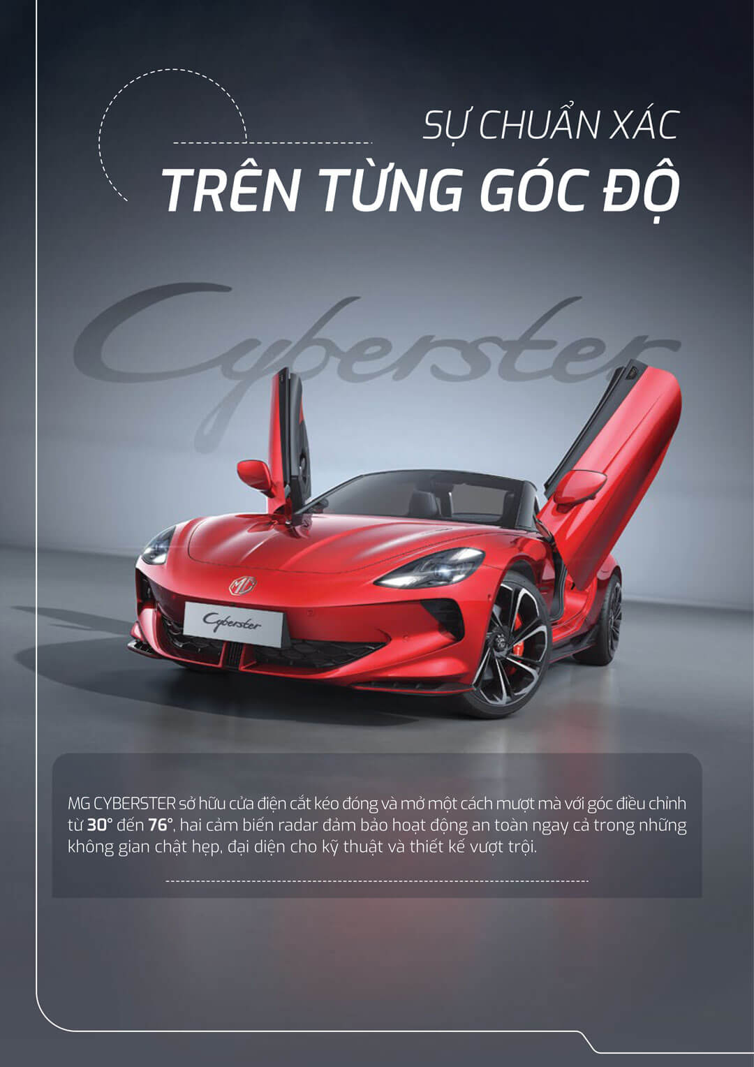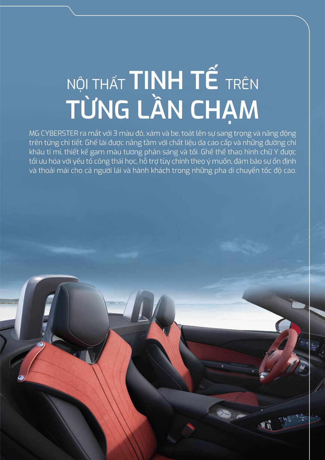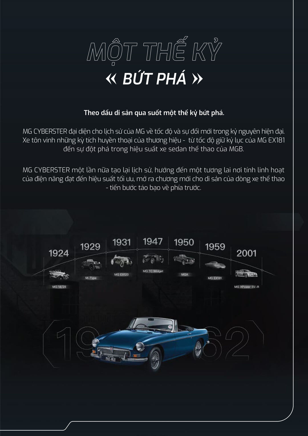 MG Cyberster là mẫu roadster thuần điện 2 chỗ, sử dụng hệ dẫn động 4 bánh với tổng công suất 536hp cho khả năng tăng tốc 0-100km/h trong chưa đầy 3.2s. MG Cyberster hội tụ những giá trị cốt lõi nhất và mang trên mình dấu ấn của MG: Hiệu suất vượt trội, Thiết kế hiện đại, và Công nghệ tiên tiến.