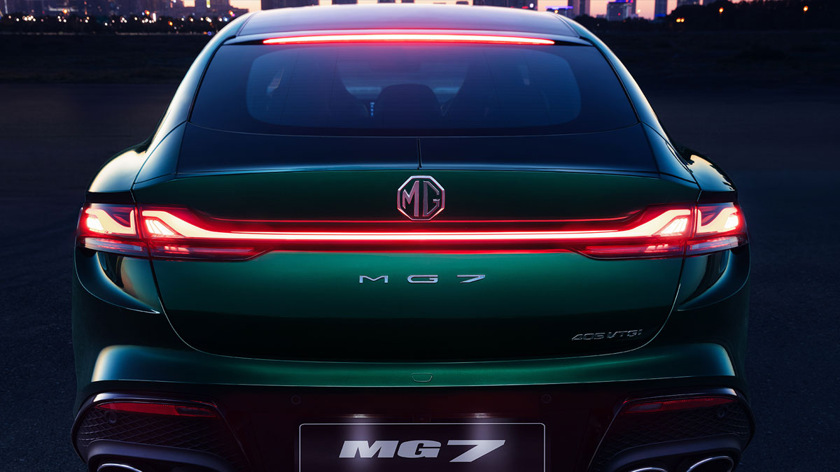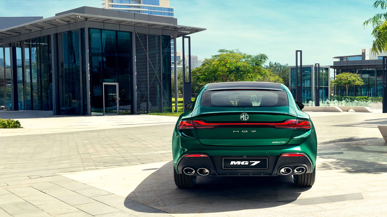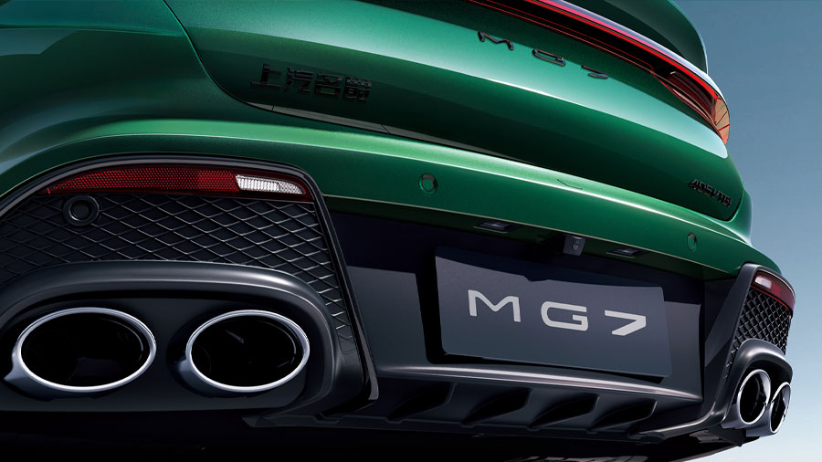 Phần đầu xe nổi bật với lưới tản nhiệt lớn, kéo dài sang hai bên,ác đường gân trên nắp capo càng làm tăng tính thể thao cho MG7. Phần hông xe với cửa kính không viền (frameless door) 2 lớp tích hợp chức năng tự nâng hạ khi đóng/ mở cửa xe giúp cân bằng áp suất. Phần đuôi xe được trau chuốt tỉ mỉ từ nóc xe vuốt dài xuống cốp hành lý sau theo phong cách fastback mang lại hiệu năng khí động học và nét hiện đại trong thiết kế. Bên cạnh đó, cụm đèn hậu full Led kéo dài toàn bộ đuôi xe tạo cảm giác liền mạch và giúp xe nổi bật khi di chuyển trong điều kiện ánh sáng thấp. Cụm ống xả kép được bố trí 02 bên với tính năng tùy chỉnh âm thanh cho cảm giác thể thao hơn.