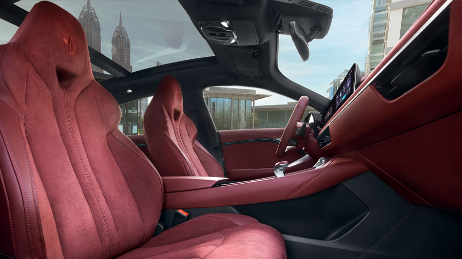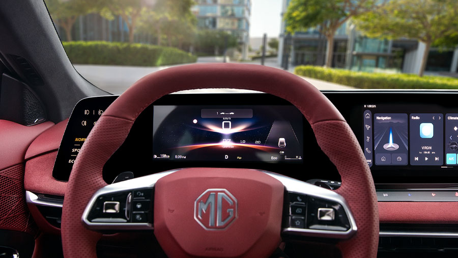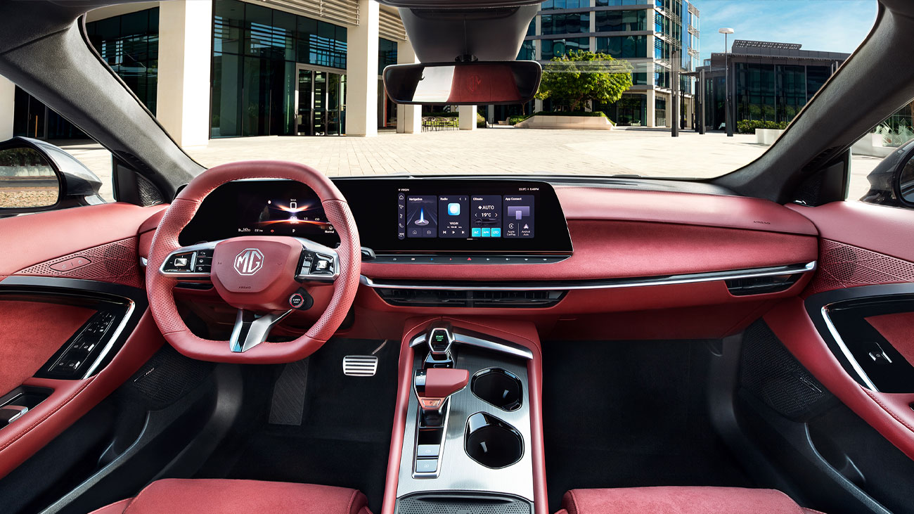 Phiên bản cao cấp nhất của MG7 với tông nội thất đỏ đen và vô lăng thể thao mang lại cảm giác hiện đại ,đặc biệt kết hợp với da Nappa sang trọng, màn hình giải trí trung tâm kích thước lớn 12.3 inch nối dài với màn hiển thị thông tin vận hành trung tâm 10.25 inch. Đây là một thiết kế thường chỉ thấy trên các mẫu xe sang cao cấp. Hệ thống giải trí của chiếc MG7 cho phép kết nối Apple carplay/ Android Auto cùng hệ thống Bose 9 loa cho âm thanh vòm chất lượng cao như một rạp hát trên xe.