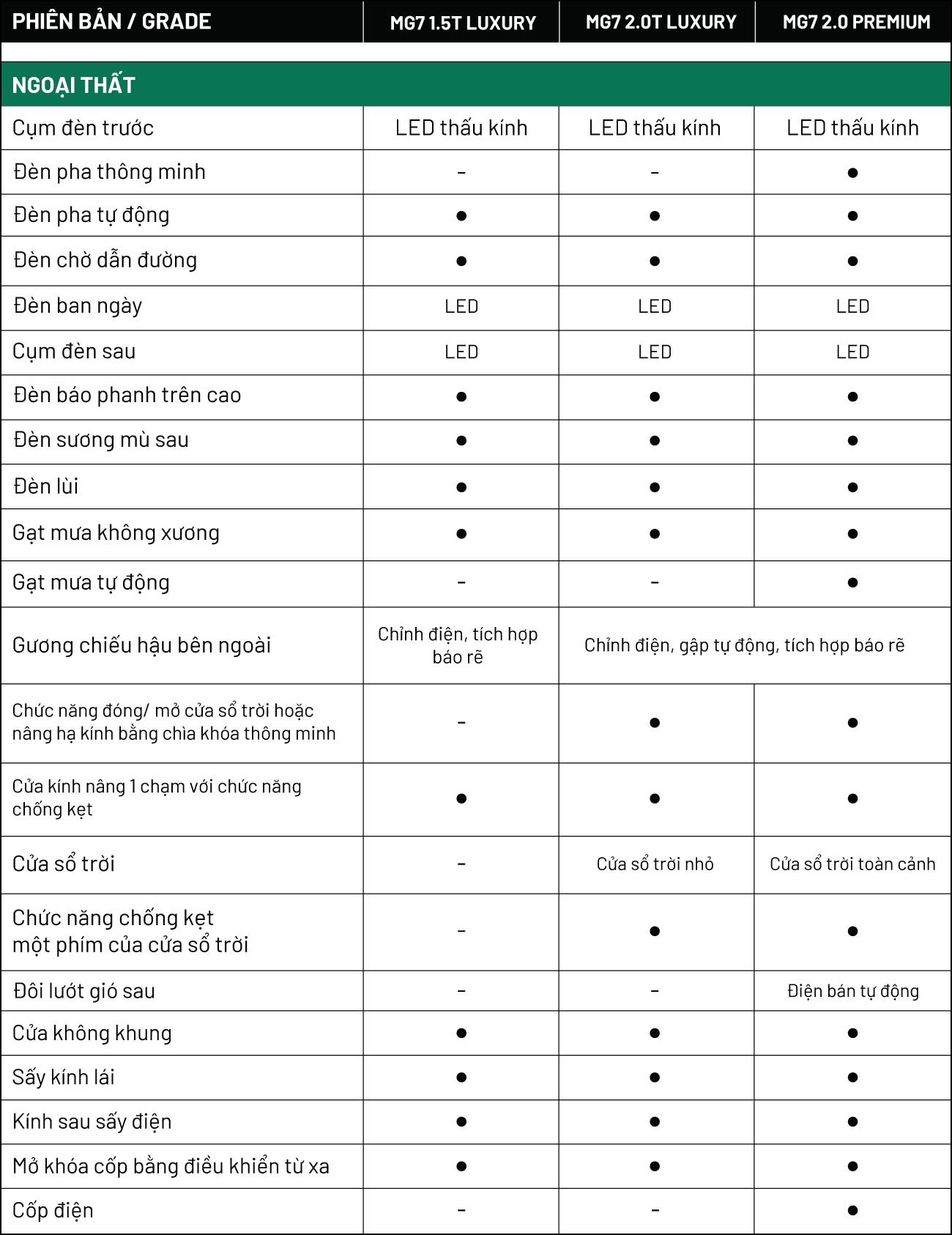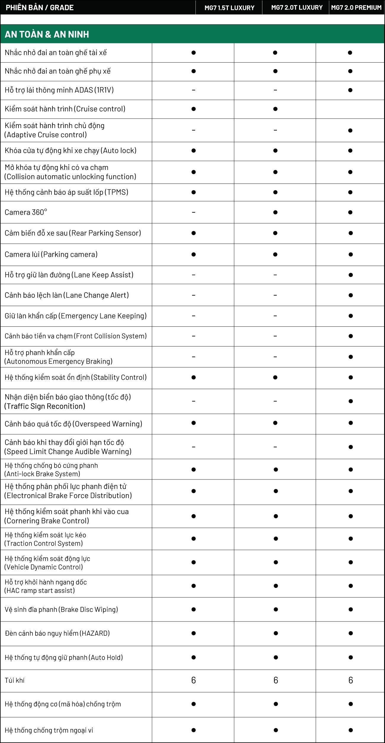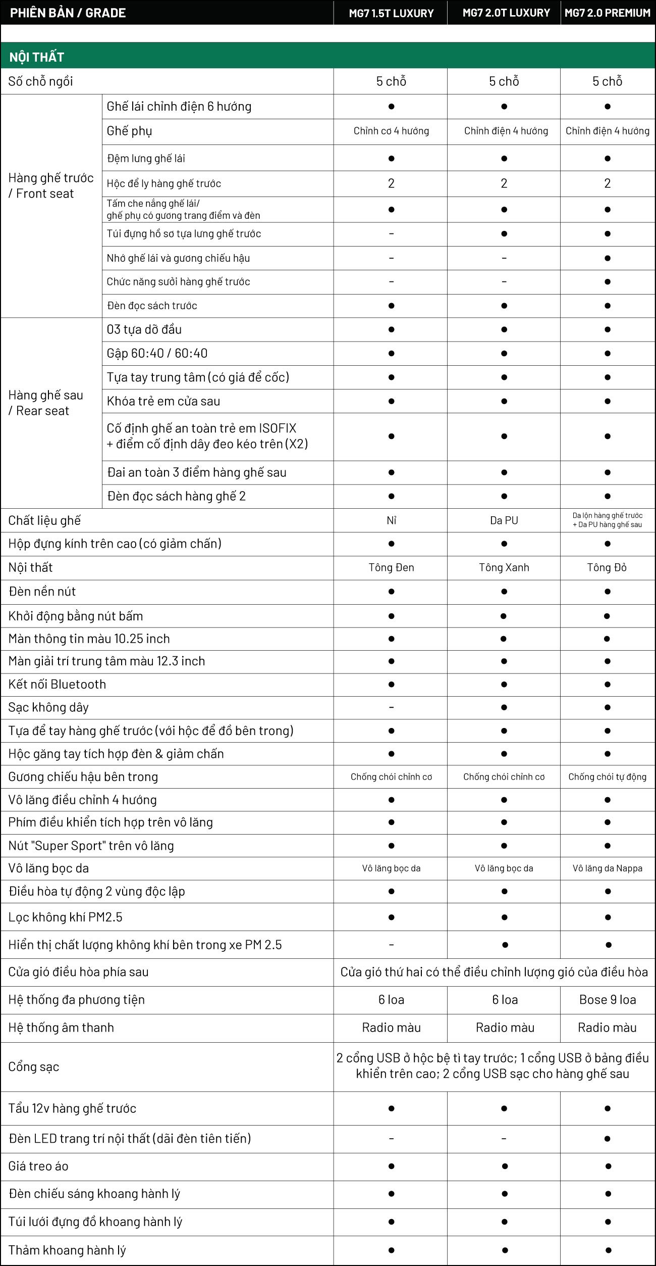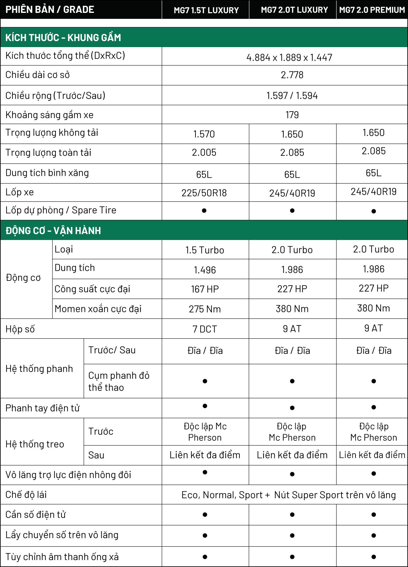 MG7 nổi bật với thiết kế ngoại thất thanh lịch, nội thất hiện đại và trang bị khối động cơ mạnh mẽ cùng hộp số mượt mà. MG7 mang đến những tiện ích vượt mong đợi và nổi bật trong phân khúc D sedan. MG7 là mảnh ghép hoàng hảo cho cuộc sống hiện đại.